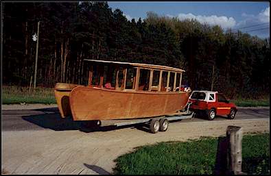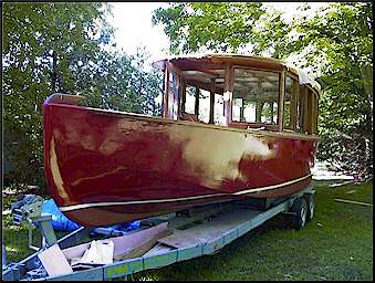 The second picture gives an overall view of the boat on the trailer.  It is still in the rough stages here, but can be seen better than in the barn.  Notice the little tracker which is really small beside the large load.