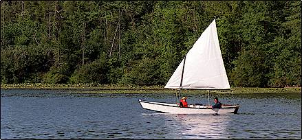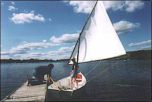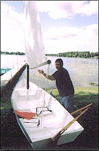It took me three weeks to finish Inscrutable. I have a little over 3 times the advertised cost of $200 in her. Some of this expense is due to the fact that at one point the learning curve was very steep and I had to pay for my mistakes. Some expense is due to the fact that I used bronze nails and fittings throughout instead of stainless steel and partly because I had a sail made for her when a used sunfish sail or a polytarp sail would have sufficed. I also had to acquire some tools even though I borrowed quite a few from my good neighbors. When I finished her I derived the same sense of satisfaction I feel when I have a professional paper published. The experienced boat builder will find many flaws in her – and I know these flaws intimately. What really amazes me is that all of my ignorance and fumbling and bumbling could not destroy the graceful lines of her design. For someone who had zero carpentry experience, she is beautiful.