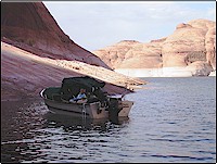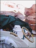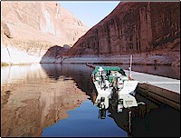 Every boating publication has already done a piece about Lake Powell, so I'll make this a bit different, touching the mechanical highlights only. Trying to describe, much less photograph, the majesty of this body of water is well beyond my skills . . . . and I've sold some of my pictures in the past. Powell is normally seen from a houseboat or a parasite PWC/speedboat towed behind one's houseboat. This is because of the marina/gasoline situation....or should I say, lack of same. GAS: Powell (approx 3600') is nearly two hundred miles long, top to bottom, with gas at both ends and at third distances along the way. About half way up the lake, side tributaries (San Juan River, 100 miles round trip, and Escalante River, 50 miles round trip) add to the mileage to be covered unfueled. In other words, if you plan to see the entire lake in your own boat and not a Winnebago with a keel, you need a150 mile range. I've got 65 gallons below deck in my 20' Tolman skiff and have to avoid the temptation of running up every inviting canyon on the way back from, say, the upper reaches of the San Juan River.