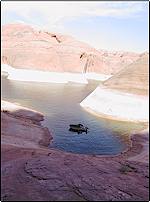 WATER LEVEL: It's down 35' from full right now, but this opens up more sandy beaches for afternoon lounging...it also brings big, hard things near the surface. It's not unusual for one's depth finder to go from 400' to 20' in a few hundred yards. The changing water color tells you the story but the scrapes on top of some barely submerged rocks tells one that not all skippers are paying attention; and don't expect the Park Service to tag every obstruction.