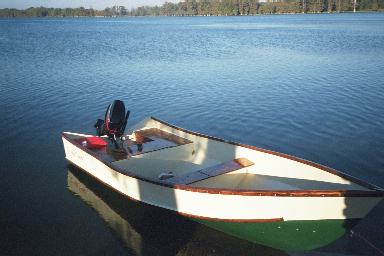 I wanted this boat to look like a wooden boat so the seats are stained and varnished as well as the gunnels, spray rails, stem and knee. the paint is basic exterior oil that seems to be holding up well so far. As one of my buddies says, ''This is one hull of a boat.''