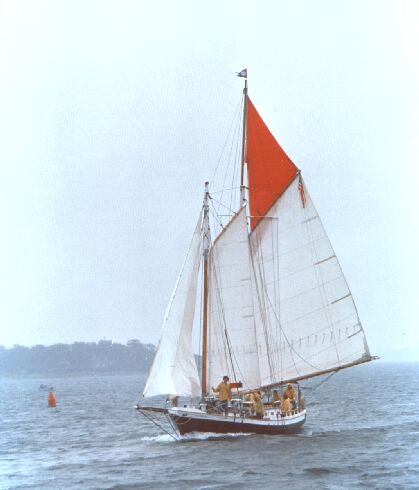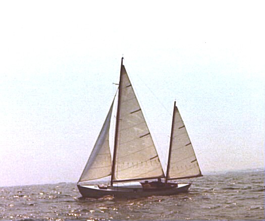 When I got this picture back from photofinisher, I thought it looked like I had photographed a diaorama. The boat is an Easport Pinky, designed by Ted Brewer. The picture was taken near Wakefield, RI.