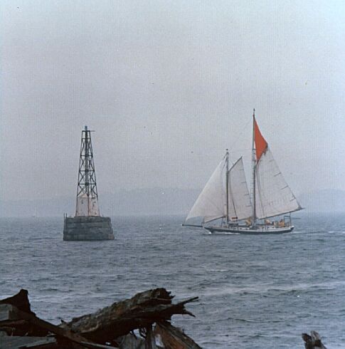 Finally, I have two shots of a large schooner coming into Noank after a schooner race run by Mystic Seaport Museum. Each fall, I wanted to take my own boat out to see the schooner races, but they were run in the latter part of October and the weather was usually like that in the pictures: chilly, windy, and spitting rain. I think this boat is by John Alden.
