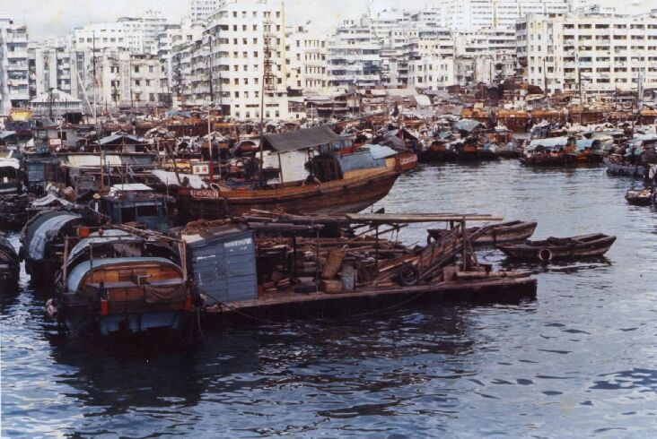 This picture was not taken in New England. It was taken in Hong Kong while I was on R&R from Vietnam in 1970. If you look carefully, you can make out a boatyard in the foreground. On the dock, closest to the camera, are piles of boatbuilding lumber. They partially obscure a junk that is out of the water 'in dry dock.' It is said that the residents of the floating city in the middle distance rarely go ashore. The Kowloon Peninsula is in the background.