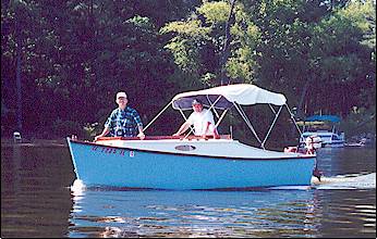 As the evening wore on, other home-boat-builders began to voyage into Dead Fish Bay, including Kilburn Adams and his Skiff America 20, of which he is designer and builder. A bit later on, Kilburn’s friend Bill Dulin and friend Betty Tilley arrived, also in a Skiff America 20. Bill likes to mention that he did not even own a power saw until he began building his Skiff, yet it is difficult to distinguish between it and Kilburn’s , who has built several boats. Both are “Bristol.”