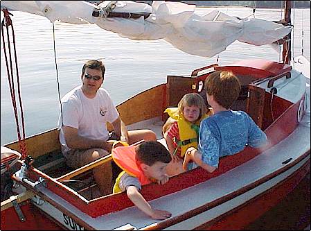 Scott Widmier and the family in the modified Pocket yacht. Nice Spanish cedar trim and ingenious portlights
