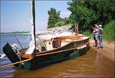 While out sailing in Jim’s birdwatcher, we spotted a tiny red boat “buzzing” around, which turned out to be Paul Brunkow’s electric - trolling - motor - powered bolger Nymph. Phil Lea was out sailing in his much-modified Bolger June Bug, and during a trip back to the launch ramp and the truck for supplies, we ran across the Scott Widmier family launching their Stevenson Projects Pocket Yacht. Like Phil Lea, Scott likes to “tinker” with boat design; the Pocket yacht had a much-modified cabin design, and Scott had even tried leeboards on the boat in the past.