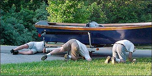 A) Closely examining a home-built boat