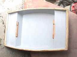 During the next week or two, spare time was spent on the finish work (always the slowest part of any job). Pete Hardy (white shorts in picture above) came down to visit and helped Alan build bow and stern seats (a modification of Don’s plans…no breasthooks since the seats tie the corners together while also serving as comfortable butt racks). A plank was milled, urethaned and suspended fore and aft between the seats, allowing one person to comfortably sit amidships. Handholds were cut. Rubrails and sheer strakes were milled and installed, along with runners along the bottom. All the seams were finished with fiberglass tape. The entire hull was copiously coated with generous amounts of epoxy to ensure durability and waterproofing. When we felt comfortable the boat was sturdy and structurally complete, we sanded and primed it to prepare for painting.