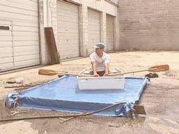 I needed a tarp for a camping trip I’d been planning. So I ran to Wal-Mart as fast as my Escort and the Philadelphia police would allow and picked up an 8’x10’ poly tarp. By the time I returned, the last coat of epoxy on the oars had dried. We found some scrap 1x6 lumber lying around the yard. With 2x4 blocks for corner bracing, we built a box approximately 6’x8’ and 6” deep. The box was leveled using the corner braces as shims. We put the tarp in and weighted it down to prevent it from blowing away. The hose was turned on and within a few cups of coffee we launched the Twig on its maiden voyage. With thick smog rolling in from the Sunoco plant we set ourselves adrift towards the concrete horizon!