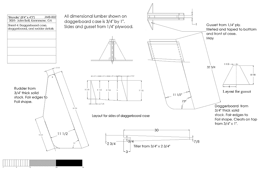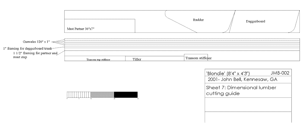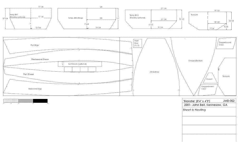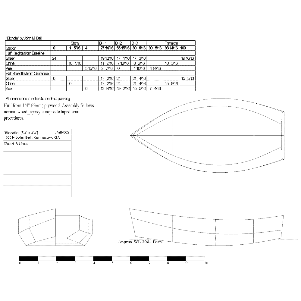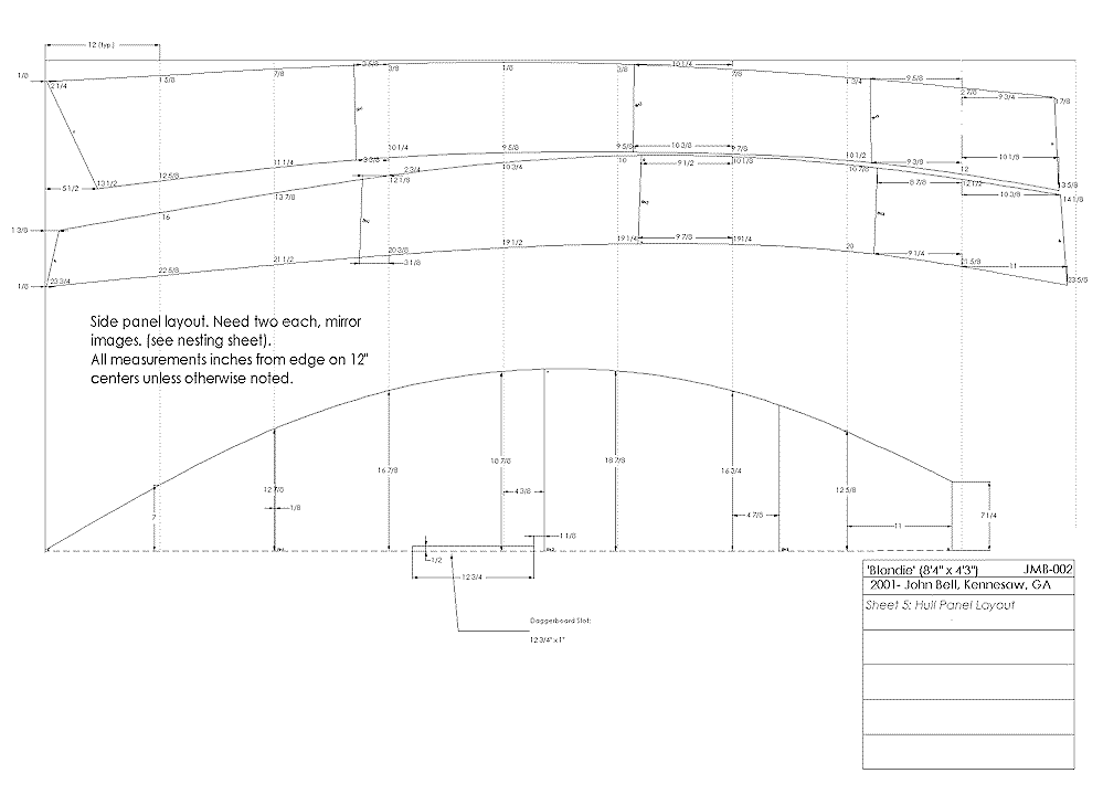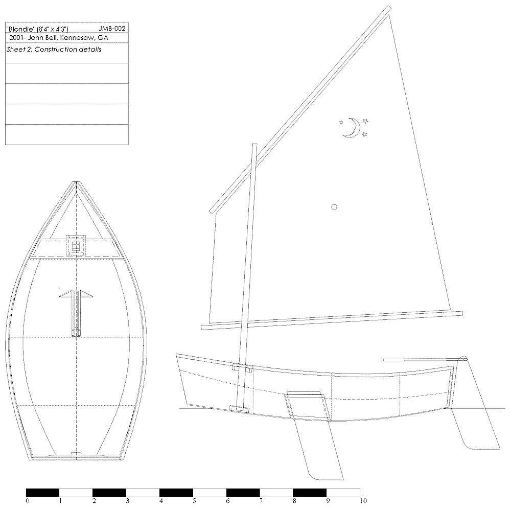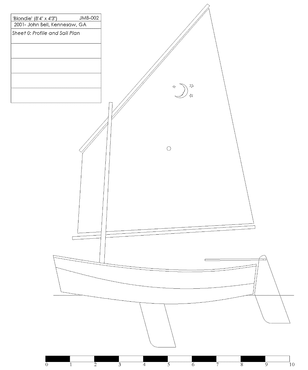 Blondie’s hull shape and hydrostatics were worked out with Gregg Carlson’s excellent Hull Designer freeware. The Hulls output was imported into TurboCad to produce these drawings. I have constructed a cardboard model that shows that the developed shape fits together without any problems.
