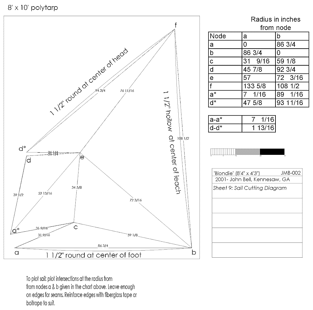 See Dave Gray and Jim Michalak’s essays on polytarp sail construction for construction details.