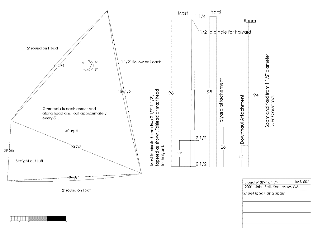 I like balanced lugs. They are easy to handle due to their self-vanging nature and the fact that they don’t need a lot of rigging. Short spars for a given sail area are another virtue. With one of her intended uses as a tender, Blondie’s rig is designed so all the spars will fit completely inside the boat making for uncluttered stowage while being towed behind a larger boat. Her 40 sq. ft. sail area is maybe a little smaller than I’d want just for myself; but since I’m planning on turning my daughter and son loose with it, it’s big enough to offer them enough danger to make them good sailors and small enough that it won’t be too overwhelming in their first (supervised) solo forays. I’ve not made any attempt to use the second polytarp allowed in the contest rules on the boat it self, so I’ll suggest it be used as a cover for storage.