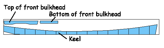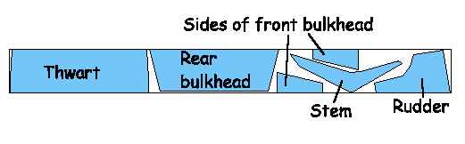 The front bulkhead is composed of four pieces of 1" lumber and also serves as a "butt plate". Since one inch is not much width for a butt plate, it may be wise to join the side and bottom parts by overlapping a strip of fibreglass tape on the outside before bending them over the bulkheads.