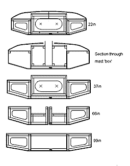 Next, a mast support 'box' fabricated from 1/2in ply and 1in battens is screwed and glued into place between the two side bouyancy tanks. This strong structure is intended to be adapted as required to accommodate a range of mast and rig options - including schemes developed to support a sailboard rig as in this project - the idea is that the lid of the box is bolted into place and can be removed and the lid and box can be modified or replaced as the new rig requires.
