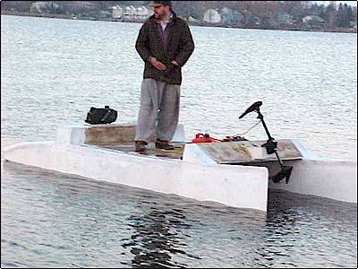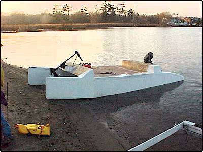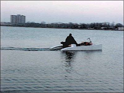 This 3.5 HP motor was on idle all the time, it is being broken in. There is a cavitation problem that I will have to sort out by lowering the mount. As a result I was leaning back and sinking the hulls a bit more to get her deeper in the water. Still moves out nicely with little wake.