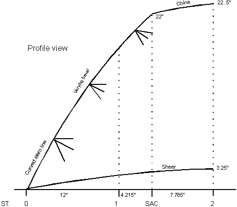 In figure 3-3, the Body view, the (maximum) bottom rocker between Beam and the heel of the stems is three inches.  The location where the two chine lines join the heel of the stem I call Stem At Chine.  For easy writing, abbreviated to SAC.  The location of Station SAC on the centerline is between stations #1 and #2.  See figure 3-1.  On the sheer line in the half-Body view of figure 3-3 that location is