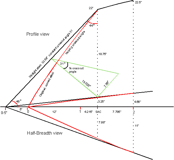 The exact length, and the rake angle of the modified stem in black lines are written in.  Also shown is how one half of the constant crosscut is determined in this to scale drawing.  When the drawing is made on one-inch-grid graph paper a high degree of accuracy is achieved, even if it is done on a one-quarter scale.  It makes the rest of the Profile and half-Breadth views redundant!  All the important values of the measurements are written in.