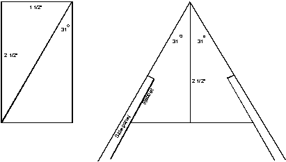 In figure 3-4, one-half of the crosscut angle is 31 degrees.  A 2"x3" ripped diagonally gives two right-triangular slats.  The tangent of the angle between the hypotenuse/cut and the 2½"-long-leg side is 1½/2½" = 0.6.  The angle is exactly 31 degrees!  Place the two 2½" sides of the slats back to back.  Cut the rabbet groove.  Miter the stem at 46 degrees.  In The Netherlands, where I was born, they say:  “Even a toddler can do the washing.”  See figure 3-5.