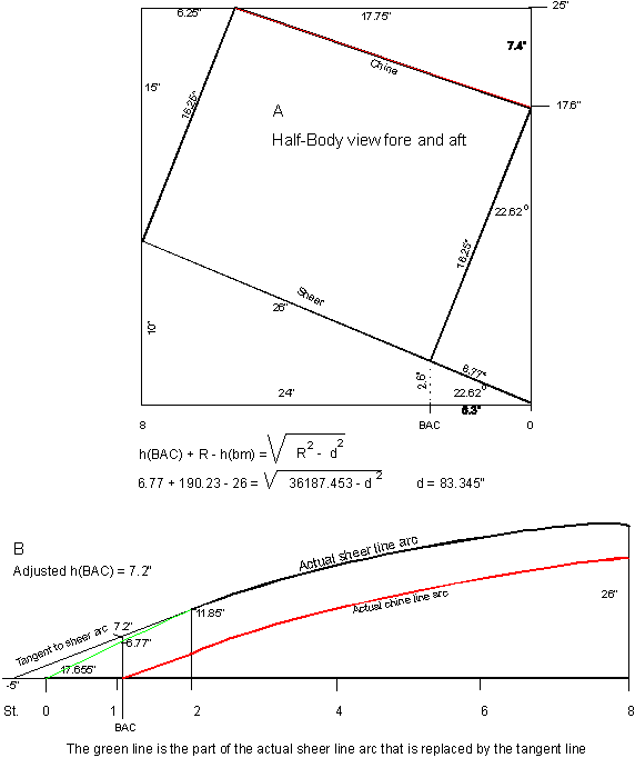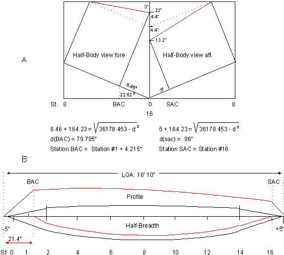 Worked out, dSAC = 79.785", or the location of station SAC = station #1 + 4.215" as is shown in figure 3-1, and more detailed in figure 3-4.  In this illustration the original curved stem and the sheer line the Profile and half-Breadth view are drawn in red.