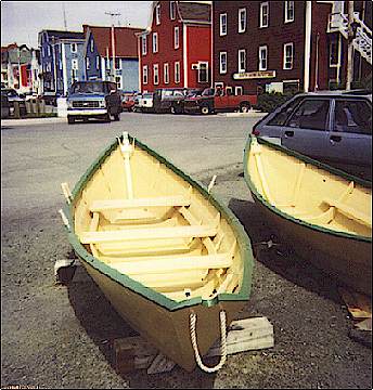 Local weather and water conditions account for the change of constant flare into varying flare. This gave more accent to the fine cod’s head; mackerel tail shape of the modern dories which is visible at the bottom.  The sheer line amidships did not change, but the side panels fore and aft were allowed to follow the straight tangent line.  The curve in the bow stem became less pronounced and is easier to make because it diminished the varying bevel of the stem.  So was the bevel of the sides of the tombstone.  With these small changes, the development of the Dory shape had reached the end of the line.  See the photograph of a new Lunenburg Dory beside The Dory Shop at the end of the wharf of that city.