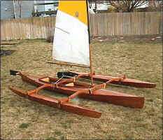 Deep down inside I knew the outrigger canoe would be a small boat for a family, but it was just so strange and wonderful, and I was determined to make it fit my criteria - with a crowbar if need be. After a frustrating period of trying to round up the John Bull plans I discovered that Chesapeake Light Craft sells plans and kits for a similar open-cockpit kayak, and even had plans for an outrigger sail rig. To make a long story short, I ordered and built the CLC Mill Creek 16.5 from a kit. As it turned out, my whole family did fit, although snugly. It gets to be pretty crowded when both boys want to help paddle. It turned out to be the largest boat I could have built in my basement anyway; I was able to get it out of the basement, but with less than an inch to spare after removing the washer and dryer at the top of the stair well. Two years have passed since I started the project. The boys are bigger now, the boat is tighter and now I’m planning my next project. But that’s another story.
