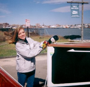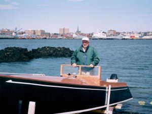THE LONG AWAITED DAY ARRIVED! APRIL 20, 2002, 10:00 AM. IT WAS SO EARLY IN THE SEASON THE FLOATS FOR THE RAMP WERE NOT IN. AS YOU CAN SEE FROM THE PHOTOS I WAS IN THE BOAT WHEN SHE WAS LAUNCHED. I STARTED THE MOTOR AND BACKED HER OFF THE TRAILER. SHE FLOATED AND WITH NOT A LEAK ANYWHERE! TRIUMPH!!!. THE PLAN WAS TO CROSS THE HARBOR TO THE PUBLIC LANDING, WHICH HAD A FLOAT, TO PICK UP MY FRIEND PAUL SLOCUMB. ON THE WAY I NOTICED THAT THE BOW SEEMED TO BE PLOWING. I REMEMBERED THAT I HAD SET THE TILT ON THE MOTOR SO THE PROPELLER WAS FORWARD. I STOPPED THE BOAT AND ADJUSTED THE TILT ALL THE WAY AFT SO THE BOW WOULD BE OUT OF THE WATER AT SPEED. IT WORKED WELL AND I PROCEEDED TO THE FLOAT. ANOTHER THING THAT NEEDED ADJUSTMENT WAS THE IDLE ON THE MOTOR. WHILE I WAITED FOR PAUL TO ARRIVE I ADJUSTED THE IDLE TO THE CORRECT SETTING.