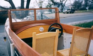 NEXT CAME THE FINAL DETAILS. I CUT THE HOLE FOR THE COMPASS IN THE DASH. THEN MOUNTED THE TRUMPET HORN (ELECTRIC) ON THE FORWARD DECK, INSTALLED THE WINDSHIELD HOLD DOWN, REMEMBER I BUILT THE WINDSHIELD FLAT SO I COULD LOWER IT FOR WIND IN MY FACE. THE FORWARD NAVIGATION LIGHTS WERE INSTALLED FORWARD AND AFT. THE MAIN CLEAT AND CHOCK WERE INSTALLED FORWARD, BOTH WITH BACKUP PLATES UNDER THE DECK AND THRU BOLTED WITH STAINLESS STEEL BOLTS AND FIBER NUTS SO THEY WOULDN’T LOOSEN. THE TWO AFT CLEATS WERE INSTALLED ON THE DRAKE TAILS WITH BACKUP PLATES AND STAINLESS BOLTS.