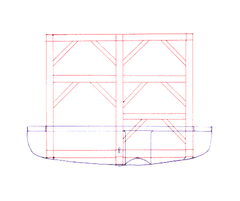 There are timber framed structures in use in North America dating from the 1700's, earlier in Europe. This type of framing produces generous open spaces unlike the confined trailer park ambience of houseboats for sale on the Internet. I like the 12 foot headroom in the two front bays. The framing on this houseboat is basic, simple mortise and tenon joins made with simple tools. Timber framers offer courses in more elaborate joinery for builders who want to try something fancy. The timbers are 8x8 white cedar. In eastern Ontario where I live white cedar is a weed. Thousands of rustic cabins are built on cedar posts. People plant cedar as a year 'round hedge. Its used for post and rail fencing in parks. This summer I paddled past a stand of cedar which would be ideal for framing the houseboat. Winter is the time to put on a pair of snowshoes, grab an axe and chainsaw, and hike into the bush to cut the trees. The logs would be hauled out over the ice by a team of horses. Working with a team of horses is a wonderful boatbuilding experience. The logs can be squared rough their whole length with a chainsaw or just where needed for joinery. The shaping of the timbers is done on the ground. They are raised in a single day by a crew of friends and favour-owers. If the houseboat is to be lived in all year in Ottawa it had better be insulated. The 8x8 framing leaves plenty of wall space for that. Cedar 8x8 beams can span 12 ft. The longest span in the houseboat is 10ft. Cedar is a preferred wood for timber framing. Hardwoods can be used at the cost of additional weight. The photo shows 8x8 corner braces which should be 6x6.