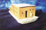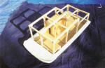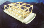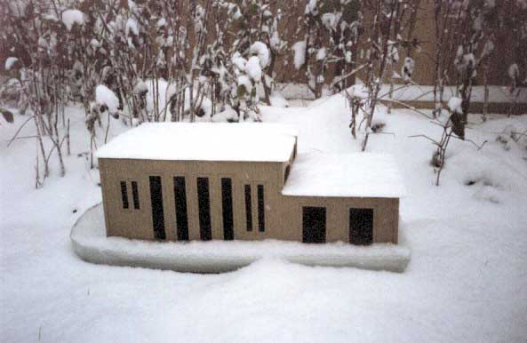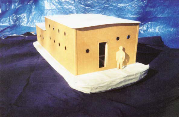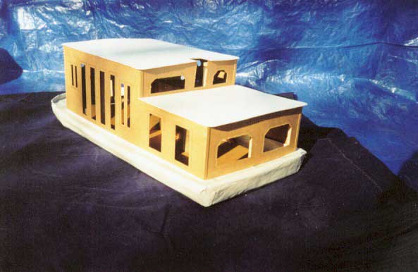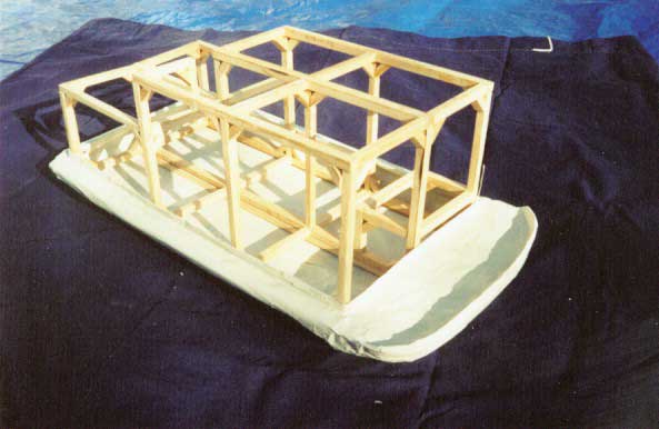 Ideas for two houseboats came to me when the competition was announced early in 2002. The one presented here is based on a timber framing book I have from the high inflation back to the land era of the 1970's, from a magazine article I recall from that time on some open concept houseboats with big windows and lots of hanging plants in False Creek, Vancouver, and from an interest in ferrocement boats. I got what additional information I could from the Ottawa public library, did some sketches and calculations, and then put the ideas aside to prepare for the boating season. During a cold wet fall I spent the time cooped up indoors preparing the ideas for an entry in the competition. I don't have any CAD software on my old 386SX computer with its DOS operating system, and I can only draw with a ruler and compasses in my hand, so decided to make a rough model and submit photos. I scaled the model so some 1/2" thick sticks I had on hand would rip into 8x8 beams. It took three tries to make a hull out of wet newspaper and four paste. The stuff warps a lot as it dries. A few days after the model was finished there was a rare half day of sunshine when I was able to photograph the model outdoors in natural light, getting covered in mud from groveling on the wet ground to get good angles. The next day the winter snows came early, a two day storm, but by then the work was done.