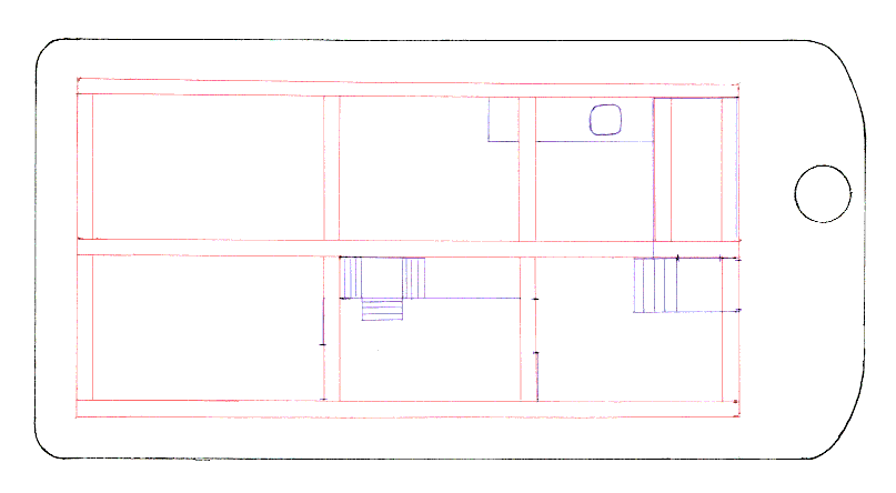 The cabin dimensions are mostly multiples of 4 ft so lumber yard material can be used to finish off the interior with little waste. The raised platform at the front is for a bathroom with space underneath for the usual tanks and for stacking cases of beer, or my preference, laying in gallon jugs of home made cider and country wine. Now that the model has been made I see I'd rather put the bathroom along the starboard side. In our area hand pumped lake water can be used for washing. I'd run a pipe through the outside wall and install a second shower head on the foredeck for outdoor showers in summer. I'd also want to design a homemade composting toilette to reduce dependence on pumpouts. We men can use a urinal to presort most of the liquids from the compostable solids.