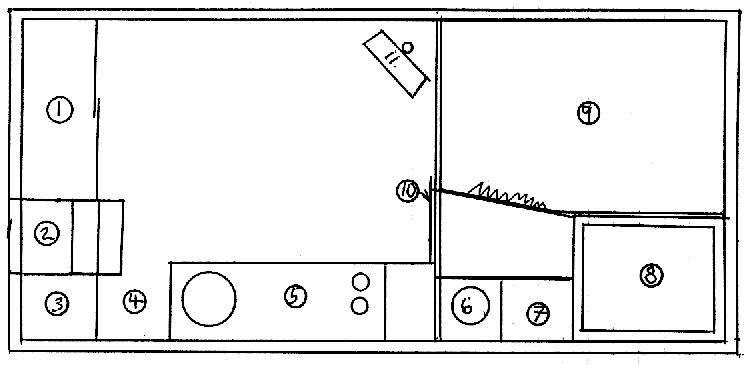 5. Galley counter - bowl sink, two propane burners, pantry,