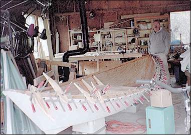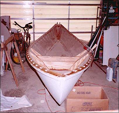 spreading the hull to prepare for fiberglass and epoxy tape, the hull is