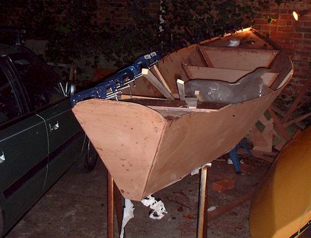 Some pics of my new dory as it slowly comes together in our car port. This is my first seriously crazy boat project, and I should point out two unusual features: the fore and aft bouyancy tanks and the central thwart, which is actually a lid covering over an space destined for ballast.