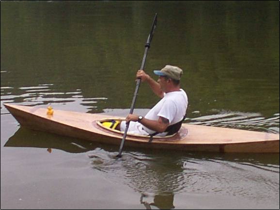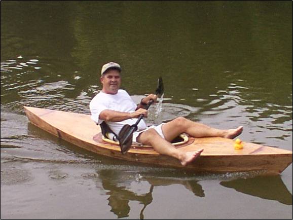 The initial stability was good and secondary also good! She had a much faster turn of speed than I expected, and carves a turn quickly. Her overall stability while underway is very good! Since she is a Yakoo she does have the deep vee'd keel that makes her track extremely well. I'll paint her over the weekend and also put some foam blocks forward and aft since there are no bulkheads in the Yakette. I still have to sand off the cockpit lip and the entire boat to get her ready to paint and then maybe some deck rigging too! She is 10'-5" long and 26 1/2" wide across the beam. Her bottom width admid ship is 20 inches, and she weighs around 25 pounds or so just guessing. When I get a new scale, I send you the exact weight. Of course you can see she's all tack and tape with epoxy. I did epoxy for the security of the strength and bonding.