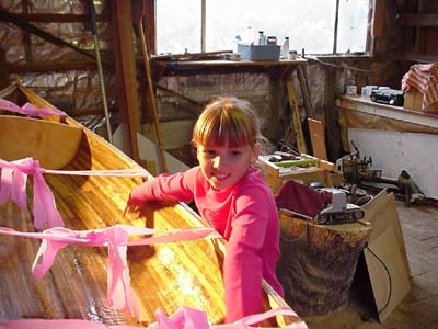 Due to interruptions from the real world, the canoe was not finished in time for the birthday deadline, but some pink bunting and a hastily-scrawled birthday greeting on a piece of scrap plywood made a very impressive present for a very happy girl. Hence the name “Gift Rapt”.