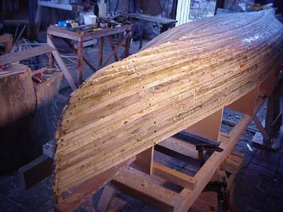 A couple of stretcher pieces had to be added as we worked towards the waterline at either end as the bend in the strips was becoming very banana-shaped and complicated by a very tight twist between the first mould and the stem, producing a delightful “kiss” in the bow. (see photo above)