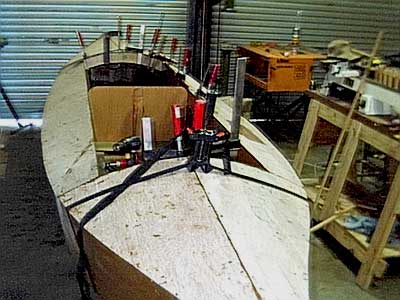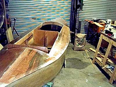 Because of the lack of strength in the ply I decided that I would have to add more framing than I had originally planed on and two layers of ply in the cockpit floor and cargo area, as well as water tight bulkheads for floatation. I also sheathed the whole outside in fibreglass cloth and epoxy [I was originally only going to tape the seams]. This meant that I ended up going through twice as much epoxy as I'd planed on and upped the cost by about $130 and upped the weight by about 30 lb.