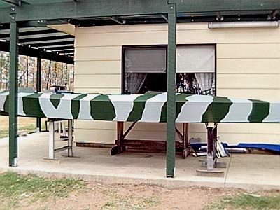 The green colour scheme didn't last long. It was just too much green. so it now wears bands of grey through it to break up the green and make it blend into the bank, just what I need for hunting. Once again my lack of skill with a brush found me holding a beer while my brother painted. It turned out well, I'm quite happy with it. The next project will be to make an outrigger for it then mount a sail, rudder and lee board, Then I suppose I'll have to learn to sail.