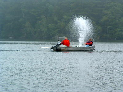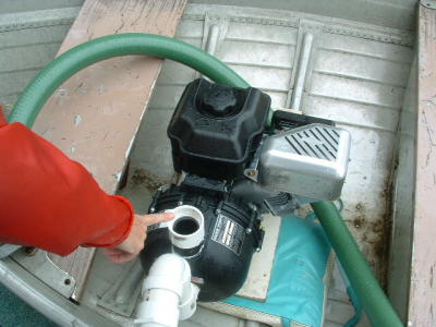 Disaster strikes! The welded pvc fitting just above the pump outlet gave way producing a rather impressive geyser. Henceforth we called the jet drive "Geyser King." Notice how Candy got the worst of it.