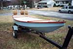I modified a trailer that I had laying around, to carry the Oracle. Jim estimates the finished weight of an Oracle built to plans to be about 80 lbs. Mine came in at about 95 pounds, but that included the doubled-bottom and full exterior sheathing, which were not ”to plans.”