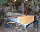 Epoxy and seam tape came from Raka. I used a layer of 4” and a layer of 3” tape on the insides of the seams. The outside of the hull received one layer of 4” tape, and then the entire exterior of the hull was sheathed with epoxy and Xynole polyester cloth, also from Raka. The inside of the hull was not sheathed.