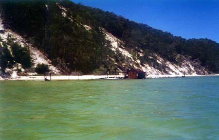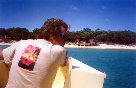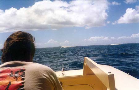 I found Bulwer by locating the two wrecks that mark it, a hell of a long way from Tangalooma. I didn't remember it being that far from my last visit, but that was twenty years ago. I drove the boat between the two wrecks to beach it, the water appeared calmer there and it would shelter us from the wind. Mistake ! The beach had become a surf beach and we took three waves over the transom before we could get the boat off the sand. I tried further down and again, no luck. Surf. Finally Wayne jumped off with a jerry can and stumbled ashore, I couldn't place him any closer than I did which meant waist deep water.