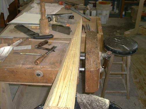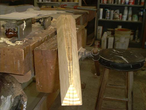 Since the taper changes the bevel on the stem, you cannot cut the bevel easily using a band saw. You COULD make a saw table where you could vary the bevel as you were cutting, but that's not really practical for just one piece. Here's another way to cut that winding bevel. I'm posting a series of pictures showing how I did it. This is only one way, but the overall time was about 2 hours doing it like this.