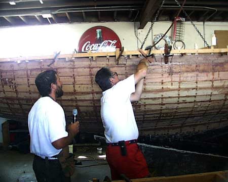 demonstrates use of an adze to fair the hull