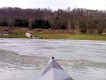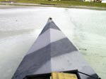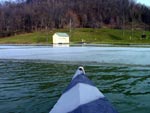 There was very little wind. That made it nice too! I felt alone and at peace! This was probably due to the fact that I was the only damn fool in the lake! In a short time I was in sight of the landing ramp and it was solid pack ice! I nudged it gently with the bow...and heard the familiar crunch! It was only about 3/4 of an inch thick, so I backed off 'bout 10 yards and threw in some rather heavy power strokes hoping to break my way through! Well..........dat didn't work! The sharp bow angle just rode the whole front end up and over onto the frozen slab! I found myself and my boat about half way up on the pack of ice landing with a thud!