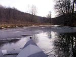 We'd had a warm spell that melted about half the lake! It was already up to 34 and I had water,.. but the landing ramp was still packed in! Further up stream it was open and the snow was gone. Just to the right of the sign is where I slipped the boat in. I read the last part and it said enter at your own risk! Looking narrowed eyed to the right and left quickly...just to make sure nobody was coming down the road, I took the risk and headed toward the lake which is about a mile!
