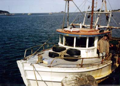 We bumble forrd to fix the trawl wing backstays to the foredeck.