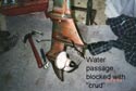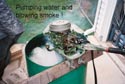 With the “headless” outboard back in the water barrel and the cordless drill reattached to the driveshaft, I got a stronger trickle of water but not near what it should have been. I put the power head back on and started up the motor and the Thermomelt crayon still indicated an overheating engine.