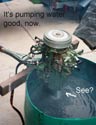 I removed the power head , and put the “headless” outboard back into the water barrel. I chucked my cordless drill to the protruding driveshaft and spun the shaft with the drill to see if the pump would shoot water out the top of the water tube. It barely trickled out.